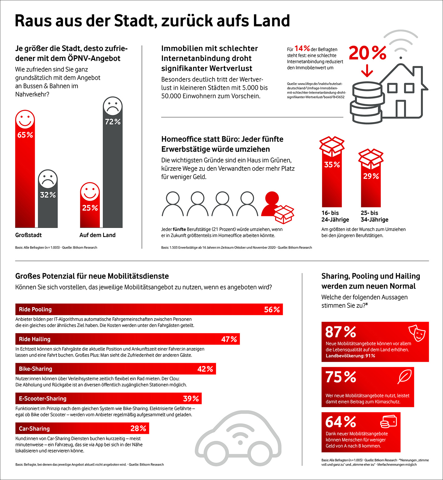 In Großstädten sind 65 % der Menschen mit dem Nahverkehr zufrieden, auf dem Land nur 25 %. Schlechte Internetanbindung führt für 14 % der Befragten zu einem Immobilienwertverlust von 20 %. Jeder fünfte Berufstätige wäre bereit, für Homeoffice umzuziehen – vor allem Jüngere. Moderne Mobilitätsdienste wie Ride Pooling (56 %), Bike- und E-Scooter-Sharing (je über 39 %) stoßen auf großes Interesse. 87 % glauben, dass neue Mobilitätsangebote die Lebensqualität, besonders auf dem Land, verbessern. Viele sehen zudem Vorteile im Klimaschutz und geringeren Reisekosten. (Quellen: Bitkom Research, Eutelsat-Umfrage)