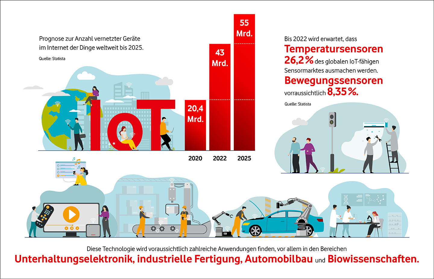 Der Mobility Report von Ericsson aus dem Jahr 2018 zeigt, dass bis zum Jahr 2024 rund 4,1 Milliarden Dinge allein per Mobilfunk vernetzt sein werden.3 Jährlich erhöht sich die Anzahl weltweit vernetzter Gegenstände seit 2013 durchschnittlich um 33 Prozent. Vodafone ist Weltmarktführer und hat 2020 schon mehr als 100 Millionen IoT-Chips im Einsatz.2 Das IoT boomt, vor allem in den Bereichen Unterhaltungselektronik, industrielle Fertigung, Waren in der Logistik, Automotive und Biowissenschaften.