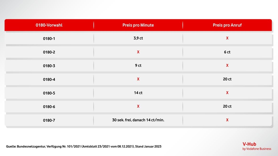 Die Bundesnetzagentur legt außerdem die Kosten fest, die Anrufer:innen zahlen müssen, wenn sie eine 0180-Service-Nummer anrufen. Das Suffix – also die letzte Ziffer der 0180-Vorwahl – bestimmt dabei sowohl das Abrechnungsmodell als auch die Kosten.