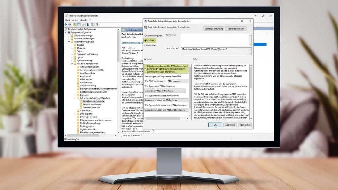 Doppelklicken Sie hier auf den Menüpunkt "Zusätzliche Authentifizierung beim Start anfordern". Setzen Sie die Richtlinie auf "Aktiviert" und setzen Sie bei "BitLocker ohne kompatibles TPM zulassen" ein Häkchen. Klicken Sie anschließend auf "OK". Eventuell bitten Sie – speziell bei Firmengeräten – Ihren Systemadministrator, diese Einstellung für Sie durchzuführen.