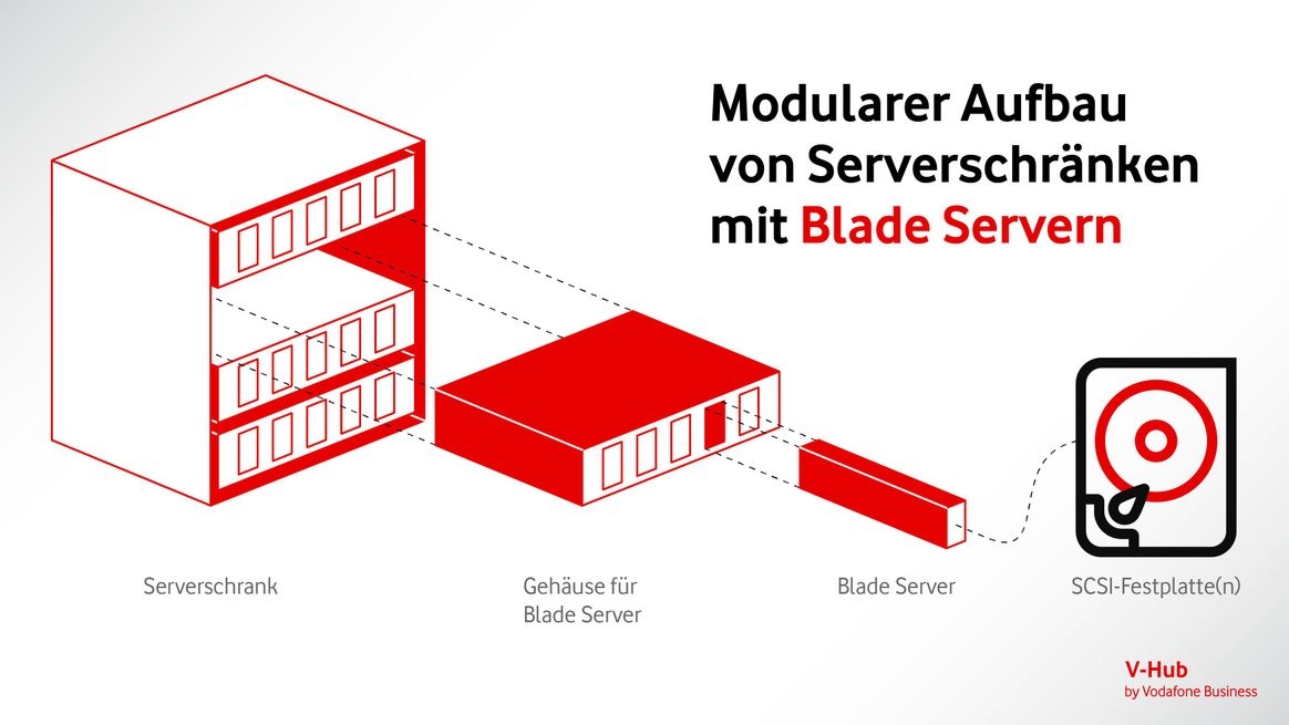 Blade Server mit SCSI-Festplatten werden in speziellen Gehäusen verbaut, die wiederum in Serverschränke passen. Alle Komponenten sind schnell und einfach auszutauschen.