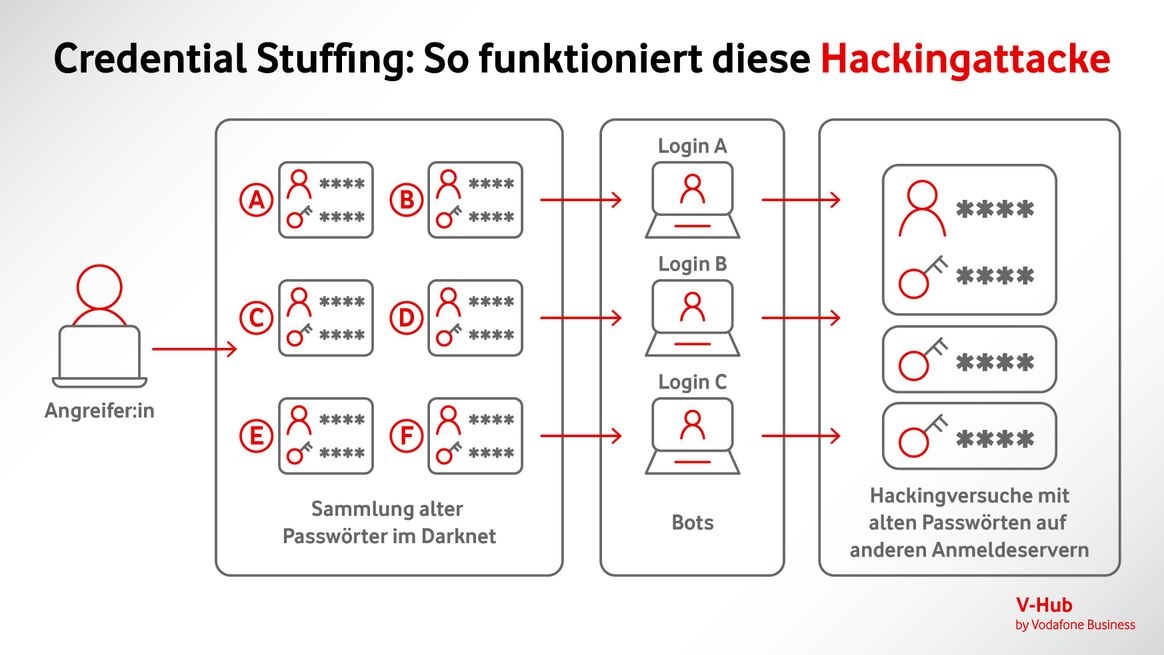 Hacker:innen verwenden hierfür sogenannte Bot-Netze, also Netzwerke aus physischen oder virtuellen Computern im Internet, deren Aufgabe es ist, die Passwörter auf vielen weiteren Plattformen auszutesten.