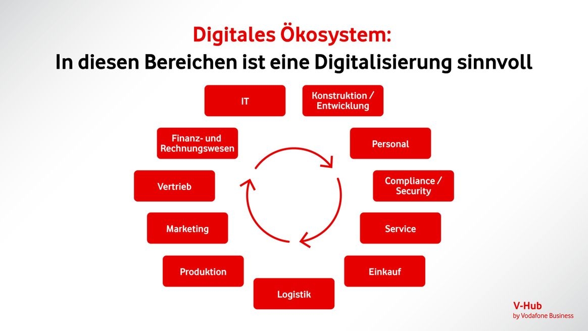 Es gibt im Unternehmen zahlreiche Computerarbeitsplätze. Die einzelnen Bereiche kommunizieren untereinander und mit anderen Abteilungen hauptsächlich digital, beispielsweise per E-Mail. Jede Abteilung nutzt die passende IT-Software für ihre Arbeit und trifft Entscheidungen zunehmend datengestützt. Wichtige Kernprozesse sind digitalisiert. So verwendet das Marketing digitale Planungstools für Kampagnen. Über ein Customer-Relationship-Management (CRM) verwaltet das Unternehmen alle seine Kundendaten. Weiterhin werden viele Informationen ausgedruckt und in Papierform weitergegeben oder archiviert. Die Produktion nutzt IT-Systeme als Steuerungs- und Überwachungsinstrument. Es gibt eine eigene IT-Abteilung oder einen externen Dienstleister, der diese Aufgabe übernimmt. Neue Software und neue Updates werden per Remote-Funktion (Fernwartung) auf allen vernetzten Geräten ausgespielt. Es gibt eine IT-Strategie im Unternehmen.