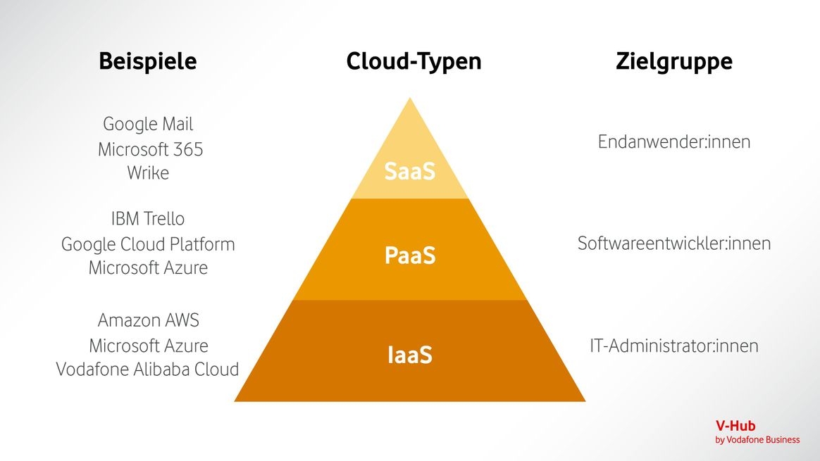 Die Cloud-Anwendungsarten IaaS, PaaS und SaaS bauen pyramidenförmig aufeinander auf. PaaS stellt die mittlere Ebene dar.