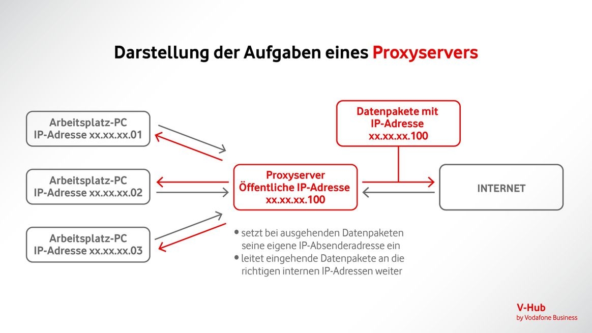 Daher ersetzt Ihr Proxy in allen Datenpaketen, die er aus Ihrem Firmennetz in das Internet weiterleitet, die individuellen IP-Adressen der Absender-Computer durch seine eigene, öffentliche IP-Adresse. Dies ist die einzige IP-Adresse, die Externe von ihrem Firmennetz überhaupt sehen können. Diese öffentliche IP-Adresse des Firmennetzes ist damit auch Zieladresse für alle eingehenden Datenpakete.