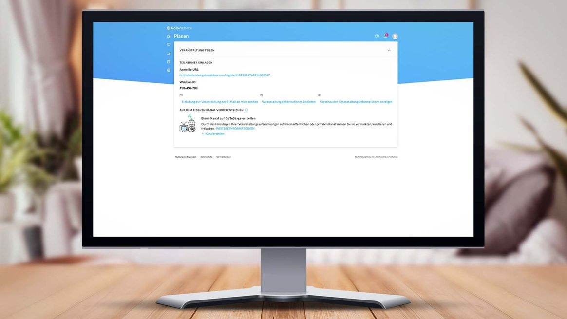 Die Anmelde-URL zum Einladen der Teilnehmer erhalten Sie, wenn Sie in das Feld „Veranstaltung teilen“ klicken. Außerdem können Sie einen Kanal in der „GoToStage” erstellen und Ihr aufgezeichnetes Webinar dort veröffentlichen. Mit nur ein paar Klicks präsentieren Sie sich und Ihre Ideen potenziell über 60 Millionen B2B-Kunden.