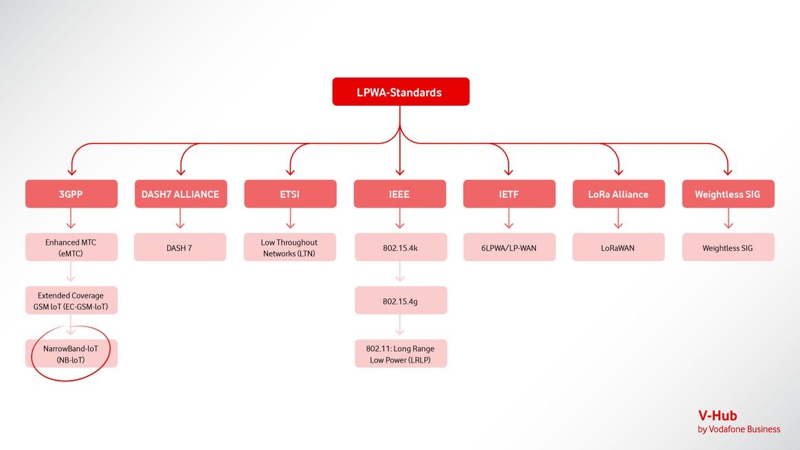 Die Abkürzung LPWA steht für „Low Power Wide Area” und beschreibt eine Klasse von Netzwerkprotokollen zur drahtlosen Vernetzung via Mobilfunk. Ziel sind neben zuverlässiger Übertragung besonders geringe Stückkosten und maximale Effizienz. Vodafone hat sich gegen andere LPWA-Standards wie LoRaWAN und für Narrowband IoT sowie LTE-M entschieden – und das aus gutem Grund.