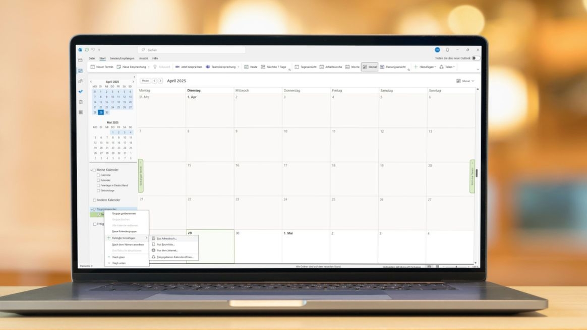 Wichtig: In Outlook (neu) gibt es im Kalendermenü zwar die Option „Kalender hinzufügen“. Hier können Sie wählen, ob Sie einen eigenen neuen Kalender bzw. neue Kalender anderer Personen oder Postfächer aus dem Verzeichnis Ihres Unternehmens hinzufügen möchten. Neue Kalendergruppen können Sie in Outlook (neu) aktuell allerdings noch nicht erstellen (Stand: April 2025). Auch wenn Sie zurück in das klassische Outlook wechseln und wie beschrieben eine neue Gruppe anlegen, führt Outlook (neu) die darin enthaltenen Kalender unter „Meine Kalender“ auf.