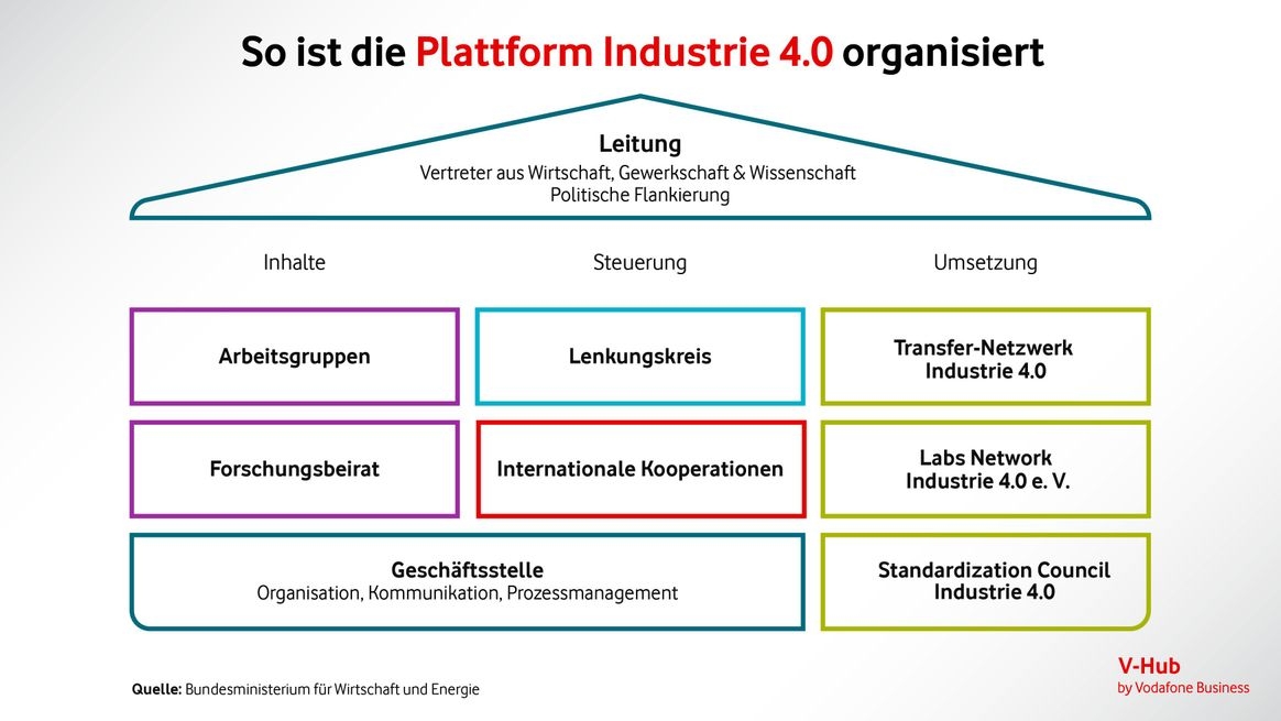 Die Plattform Industrie 4.0 versteht sich als zentrales und führendes Netzwerk Deutschlands im Bereich der digitalen Transformation. Ziel der Plattform ist es, Deutschlands Ruf als eine der führenden internationalen Industrienationen auszubauen. Sie will den digitalen Strukturwandel koordinieren und verlässliche Rahmenbedingungen schaffen.