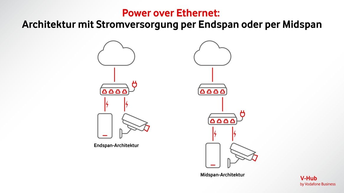 Beim Nachrüsten von PoE-fähigen Routern in einem Bestandsnetzwerk spricht man auch von einer Midspan-Architektur. Neue Netzwerke können Sie hingegen direkt ausschließlich mit PoE-fähigen Geräten errichten. Dies wird auch als Endspan-Architektur bezeichnet.
