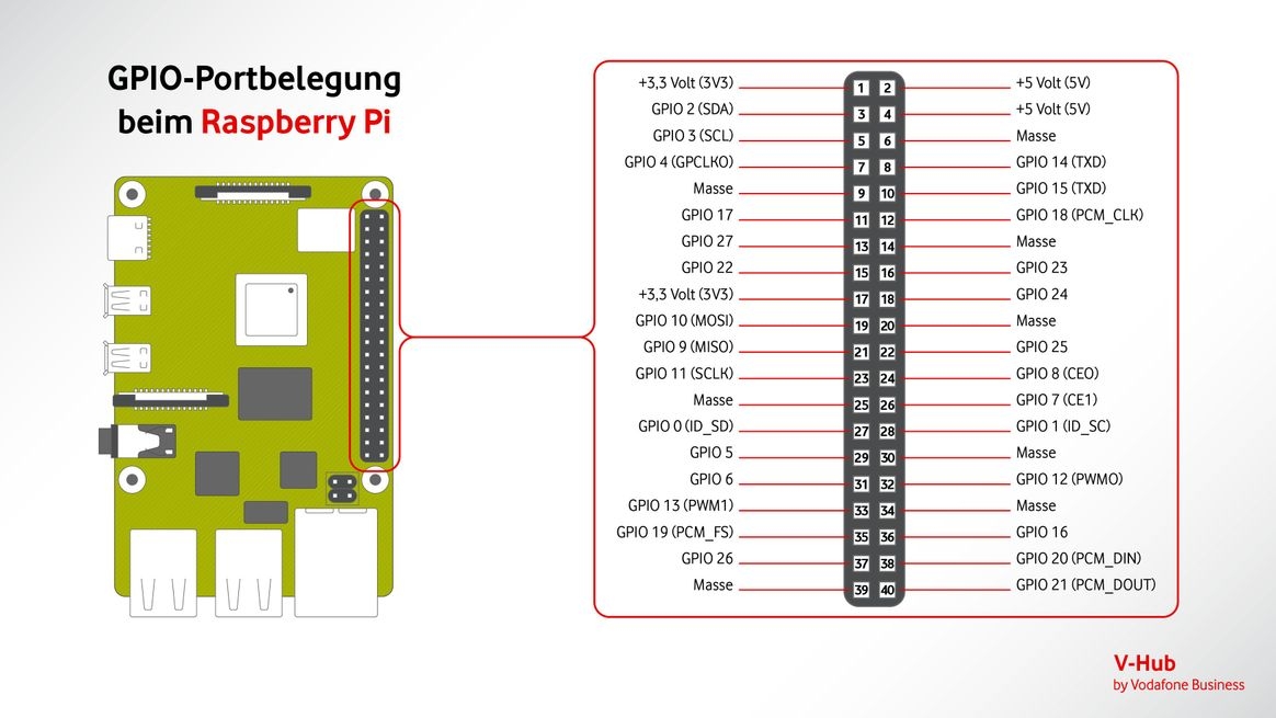 Für den Datenaustausch mit anderen Geräten braucht ein IoT-fähiger Computer Kommunikationsschnittstellen. Der Raspberry Pi hat hierzu ein sogenanntes GPIO-Board mit 40 Pins verbaut. GPIO steht für „General Purpose Input/Output”. Das GPIO-Board dient dazu, Sensoren, Aktoren, LEDs, Motoren und ähnliche Bauteile für diverse Zwecke mit dem Raspberry zu verbinden.