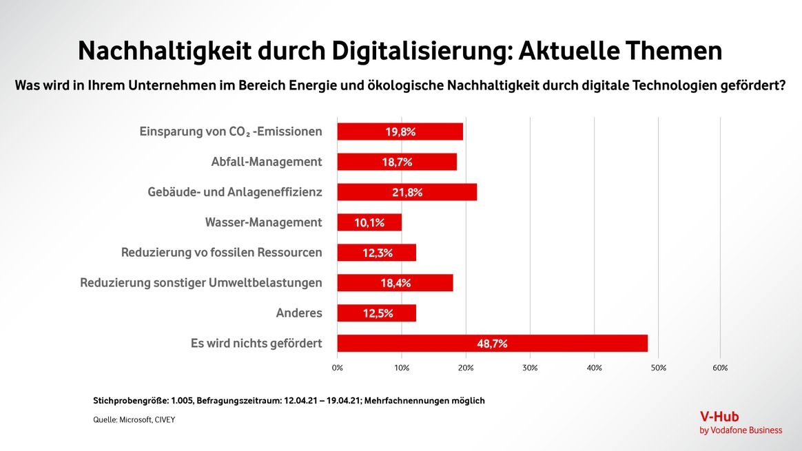 Die 27 Staaten der Europäischen Union (EU) verfolgen das Ziel, bis 2050 CO2-neutral zu werden. Expert:innen schreiben Technologien und konkret der Digitalisierung hierbei eine entscheidende Rolle zu. Die Einhaltung ökologischer Standards in Kombination mit Digitalisierung bietet Unternehmen sowohl die Chance, sich nachhaltiger aufzustellen als auch ihre Wettbewerbsfähigkeit auszubauen. Wie Digitalisierung und Klimaschutz erfolgreich vereint werden können, beweist Vodafone mit seinem europaweit g zu 100 Prozent mit Öko-Strom betriebenen Kommunikationsnetz. Darüber hinaus hilft Vodafone anderen Unternehmen mit digitalen Lösungen im Bereich IoT und Cloud erfolgreich zu agieren und mit neuen Tarifen zusätzlich ihren CO2-Fußabdruck zu minimieren.