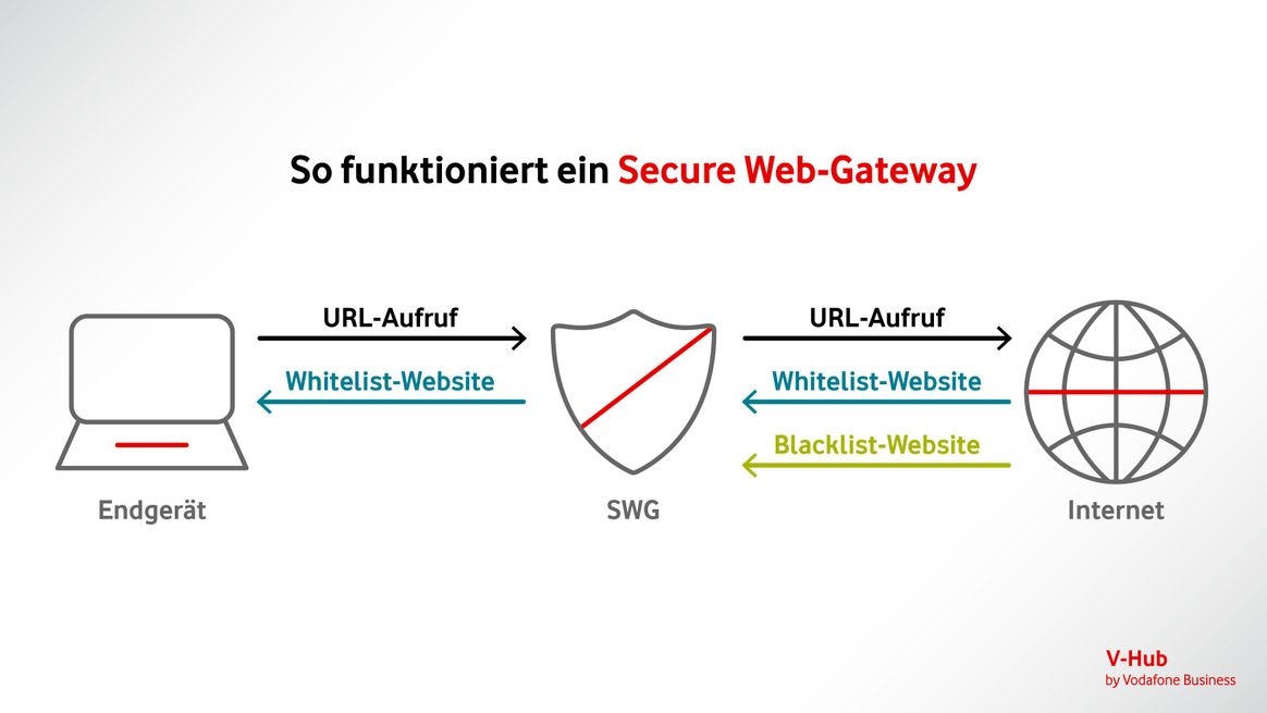 Ein URL-Aufruf läuft über das SWG. Handelt es sich um eine Whitelist-URL, wird der Traffic weitergeleitet. Bei einer Blacklist-URL blockiert SWG die Anfrage.