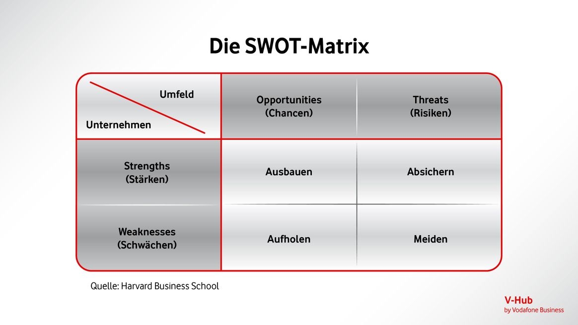 Mit der SWOT-Matrix identifizieren Sie Stärken und Schwächen und leiten daraus Handlungsempfehlungen ab.