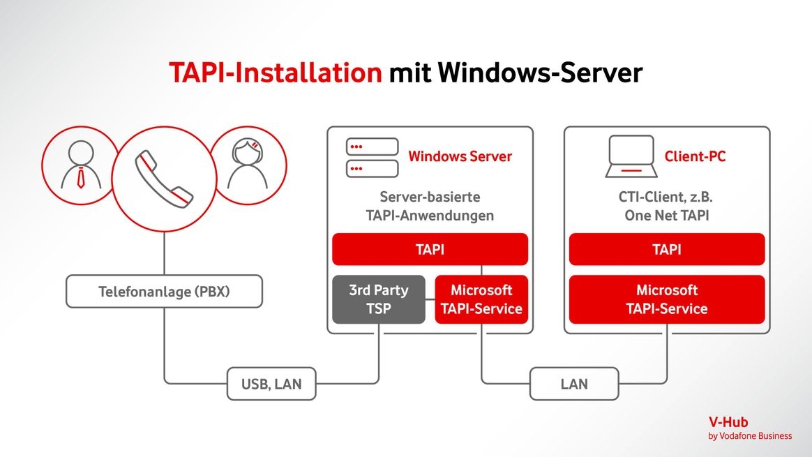 Außerdem ermöglichen TAPI und moderne Telefonanlagen wichtige Funktionen wie Warteschleifen, die Verteilung eingehender Anrufe auf „freie“ Mitarbeiter:innen und Ähnliches. Virtuelle Telefonanlagen können Anrufe auf am Computer angeschlossenen Telefone weiterleiten, sogenannte Softphones. Eine Weiterleitung ist auch auf Mobiltelefone und herkömmliche Tischgeräte möglich.