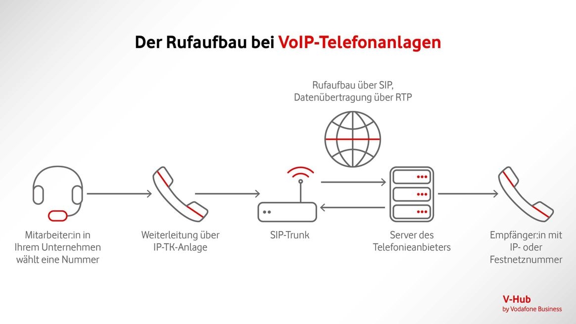 - Der Trunk vermittelt den Anrufversuch per Session-Initiation-Protocol (SIP) über das Internet an den Server Ihres Telefonieanbieters.