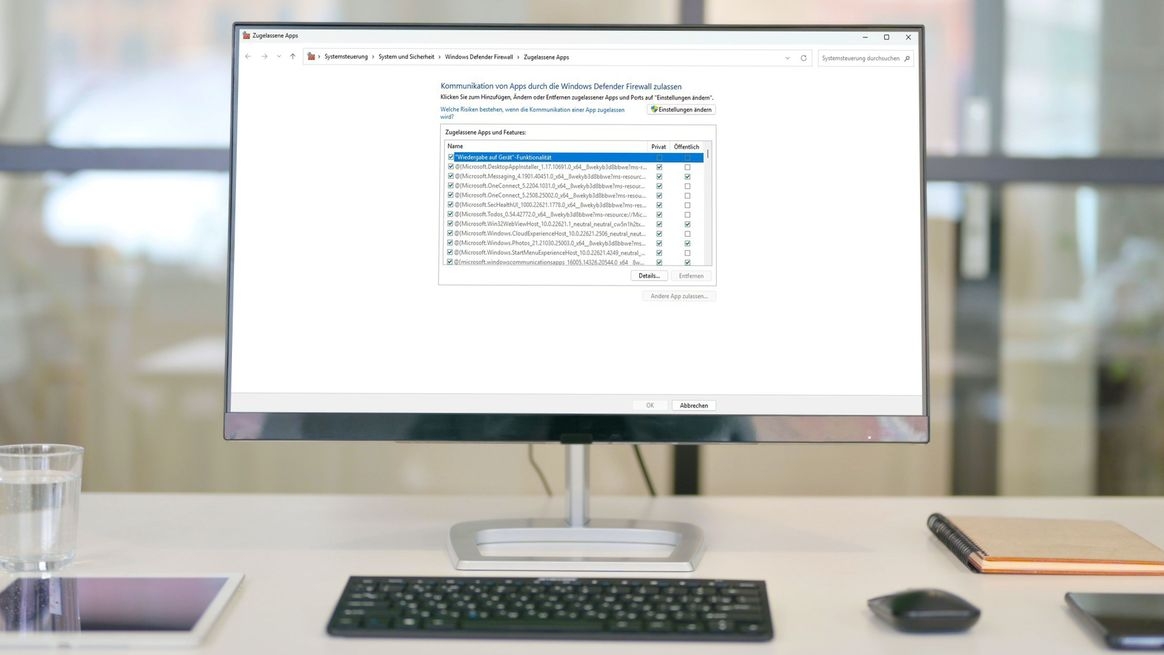In den App-Einstellungen können Sie die Kommunikation von Apps über die Windows Defender Firewall zulassen. Klicken Sie hierfür im Firewall-Grundmenü auf „Zugriff von App durch Firewall zulassen“. Daraufhin öffnet sich ein Untermenü, das die Apps auf Ihrem Gerät anzeigt. Die Häkchen markieren, ob die Anwendungen in der privaten und öffentlichen Domäne Daten senden und empfangen dürfen. Durch einfaches Anklicken entfernen Sie diese Häkchen, um Kommunikation zu verbieten; bzw. Sie setzen neue Häkchen, um Kommunikation zu erlauben.