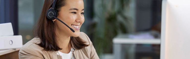 Eine Frau sitzt mit einem Headset vor einen Computer und lächelt.