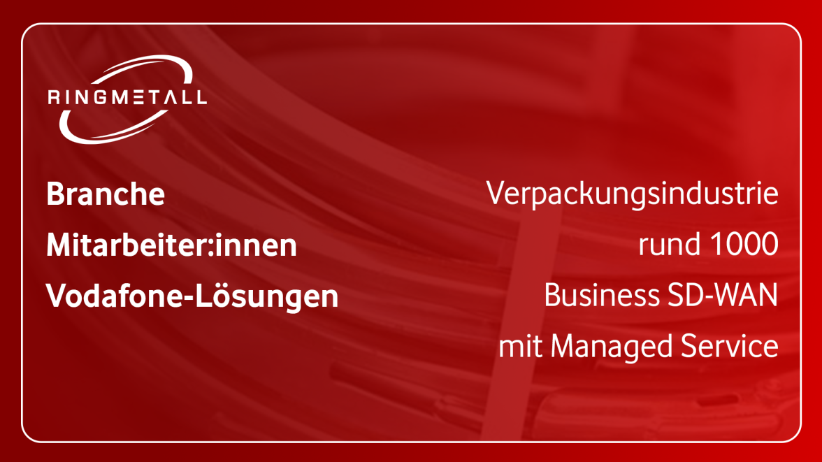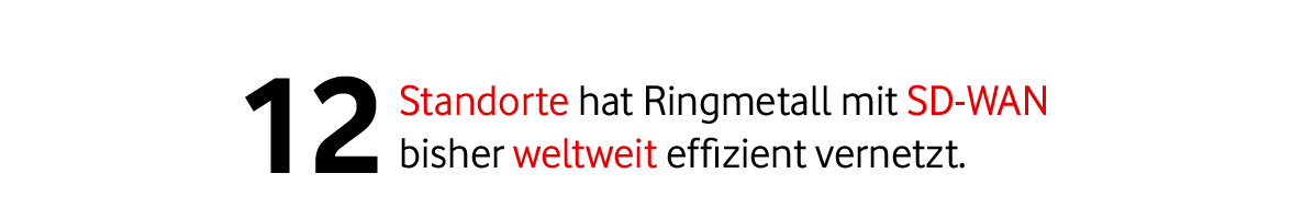 Ringmetall setzt für die Internetanbindung und Vernetzung seiner Standorte im In- und Ausland auf SD-WAN von Vodafone Business. Dabei entlastet das gewählte Managed-Service-Modell die hauseigene IT-Abteilung. Über die per SD-WAN realisierten Standortanbindungen laufen nicht nur die interne und externe Datenkommunikation sowie der Zugriff auf zentrale Dienste, sondern beispielsweise auch die IP-basierte Telefonie der Unternehmensgruppe.
