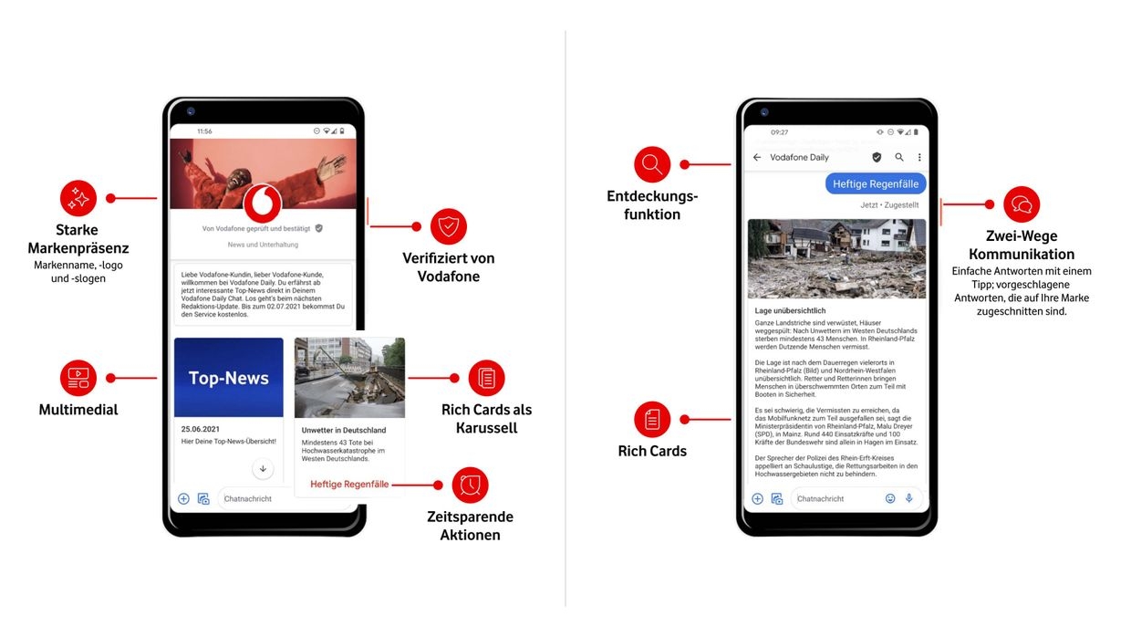 Hiermit können Sie zusammenhängende Infos, Medien oder Vorschläge als eine Einheit versenden. Sie können Rich Cards einzeln oder in einem Karussell senden. Rich Cards können Medien, Titel, Beschreibungen, Antwortvorschläge und Aktionsvorschläge enthalten.