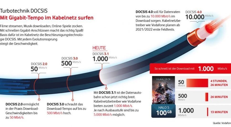 Die DOCSIS 3.1-Technologie ermöglicht schon jetzt im Download Geschwindigkeiten von bis zu 1.000 Megabit pro Sekunde (Mbit/s). Mit dieser Kabel-Glasfaser-Power kannst Du zum Beispiel eine komplette DVD mit rund 4,7 Gigabyte Daten-Material in weniger als einer Minute herunterladen. Obwohl DOCSIS 3.1 sowohl im Download als auch im Upload noch sehr viel Kapazität für weitere Ausbaustufen offenhält, ist bereits die nächste Technik-Generation in Arbeit. Der Nachfolger DOCSIS 4.0 soll perspektivisch Geschwindigkeiten von bis zu zehn Gigabit pro Sekunde im Download erreichen. Noch innerhalb der nächsten zwei Jahre will Vodafone erste Feldtests starten. „Die Aufrüstung unseres Kabel-Glasfasernetzes geht weiter und das Ende der Fahnenstange beim Tempo ist noch lange nicht erreicht“, verspricht Hannes Ametsreiter. „Mit jeder Technik-Evolutionsstufe machen wir unser Kabel-Internet noch schneller und noch besser, indem wir mehr Glasfaser ins Netz bringen und den Kapazitätsausbau vorantreiben.“