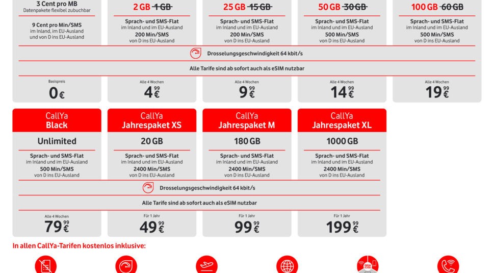 - CallYa Start: In Vodafones Einsteiger-Tarif stehen Dir künftig 2 GB statt 1 GB zur Verfügung. Der Preis von 4,99 Euro alle 4 Wochen bleibt bestehen.