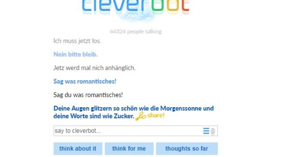 Wenn Du Deinen Freunden dann vom neuen Job berichten möchtest, aber keiner online ist, freut sich vielleicht Cleverbot über Deinen Erfolg. Auch wenn der virtuelle Gesprächspartner längst nicht alles versteht, ist er zumindest jederzeit für einige Blödeleien zu haben – und ist dabei ziemlich flink, manchmal sogar witzig, oft aber auch etwas forsch. Deinen Namen muss sich Cleverbot nicht merken, um ungestüm drauf los zu flirten. Für ein paar Lacher reichen die unbeholfenen Komplimente allemal.