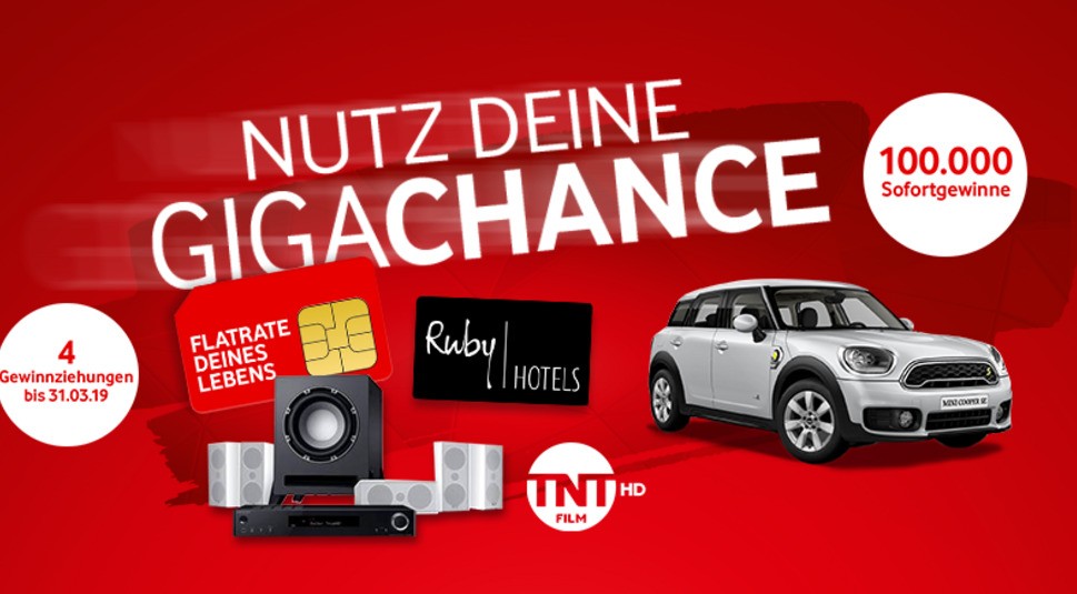 Ein brandneues Auto als Hauptgewinn, drei weitere krachende Spielrunden mit über 250 Wochengewinnen und dazu noch 100.000 Sofortgewinne: Nutze Deine GigaChance jede Woche bis zum 31. März und räume mit ein wenig Glück saftige Gewinne ab.