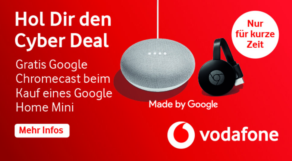 Vom 23. bis zum 27. November kannst Du Dir bei Vodafone den Cyber Deal sichern. Beim Kauf eines Google Home Minis bekommst Du während des Aktionszeitraums einen Google Chromecast gratis dazu – so lange der Vorrat hält natürlich. Einzige Voraussetzung: Du musst den Deal über die Vodafone Zubehör-App (nur für Android) oder den Vodafone Smartshop abwickeln.