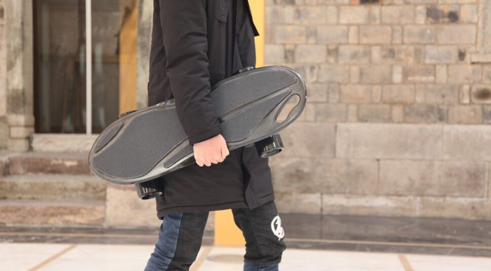 Hergestellt ist das im edlen Schwarz gehaltene Brett aus einem leichtgewichtigen Spezialkunststoff, umhüllt mit Kohlefaser, was gleichzeitig für Stabilität und Flexibilität sorgt. Es ist 70 Zentimeter lang und hat eine bequeme Breite von 27,5 Zentimetern. Je nach Version wiegt das KingKong Pro 6,3 beziehungsweise 6,95 Kilogramm. Der Doppelantrieb jagt das Gerät auf bis zu 35 Kilometer pro Stunde hoch. So sind auch Steigungen von bis zu 25 Prozent kein Problem mehr. Mit dem 4.300 Milliamperestunden fassenden Akku kommst Du maximal 20 Kilometer weit, was innerhalb der City schon einiges bedeuten kann.