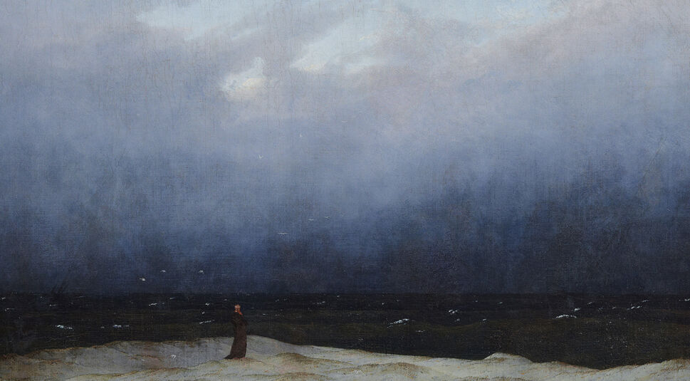Bis zum Horizont verdunkeln zerzauste Wolken den endlosen Himmel. Darunter schwappen in bleierner Schwärze die Wellen der unruhigen See. Erst auf dem zweiten Blick fällt Dir in der Ferne eine winzige Gestalt in langer, dunkler Kutte auf. Verloren steht sie auf einem schmalen Sandstreifen und schaut in Richtung Meer. Du folgst ihrem Blick und erkennst die Silhouette eines Segelschiffes, das bedrohlich schief im Sturm zu taumeln scheint. Aus dem Nichts taucht der Schatten eines zweiten Schiffes auf, dessen diffuse Konturen ebenso schnell wieder verblassen. Du wendest Dich erneut der Gestalt am Ufer zu und erschrickst: Mit leerem Blick steht sie plötzlich direkt vor Dir. Es ist der „Mönch am Meer“. So heißt das berühmte Gemälde von Caspar David Friedrich, in dem Du Dich gerade virtuell befindest.