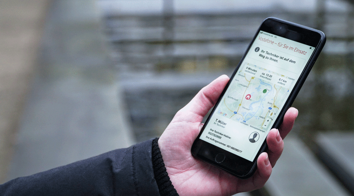 Vodafone hat zusammen mit seinem hauseigenen Software-Labor crvsh den Service „myTechie“ entwickelt, die Dir in Echtzeit sagt, wo sich der für Dich angekündigte Vodafone Techniker gerade befindet. Schnelle Kontaktaufnahme und kurzfristige Terminänderung machen Servicetermine für Deinen Kabel-Anschluss so reibungslos wie noch nie.