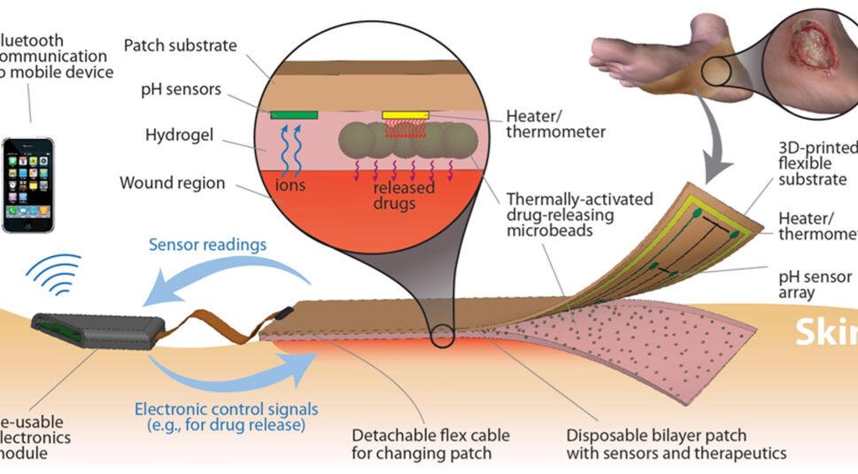 Für optimale Wundheilung soll in Zukunft ein smarter Verband sorgen, den Forscher der Tufts University in Massachusetts entwickelt haben. Dessen eingebaute Sensoren überwachen die Wunde dann permanent und kümmern sich auch um die Versorgung mit Medikamenten. Denn bei Bedarf gibt der Verband automatisch die benötigte Dosis aus einem integrierten Depot ab. So können Verletzungen optimal abheilen und das Entzündungsrisiko sinkt.