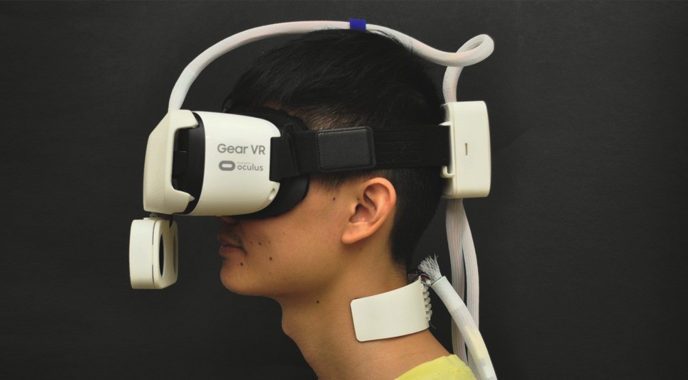 So richtig bequem sieht das aktuell noch nicht aus, aber Forschung soll ja auch nicht bequem sein. Das Ventilatoren-Add-on für die Samsung Gear VR pustet Dir maßgeschneiderten Wind um die Ohren. Währenddessen trägst Du eine Art Halsmanschette, die über zwei Module im Nacken Dein Temperaturempfinden beeinflusst. Es geht dabei nicht einfach um ein teures Wärmepflaster. In der Realität wechselt Dein Temperaturempfinden nicht sprunghaft hin und her, sondern schrittweise. In gleicher Art und Weise soll auch das Nackenmodul dieses Empfinden simulieren.