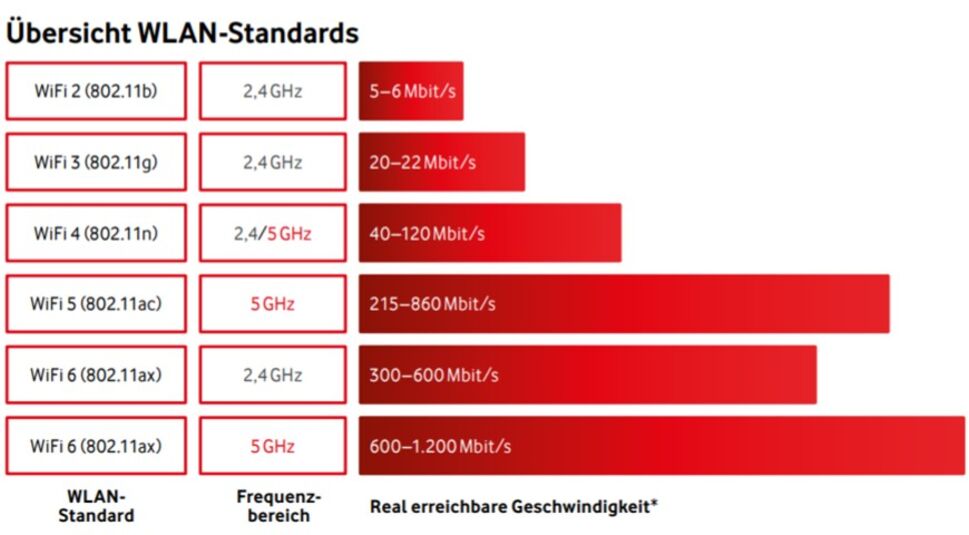 Moderne Geräte mit Wi-Fi 5 und Wi-Fi 6 haben die höchsten Übertragungsgeschwindigkeiten. Allerdings können die meisten Geräte noch gar keine 1.000 Mbit/s abrufen. In den technischen Daten der Hersteller findest Du den WLAN-Standard.