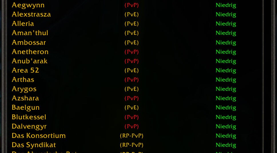 Nach der Installation musst Du Dich für eine Serverregion entscheiden: Du kannst auf amerikanischen, asiatischen oder europäischem Server spielen. Für Spieler aus Deutschland sind die Europa-Server vorgesehen. Anschließend geht es darum, den für Dich richtigen Realm zu finden. Es gibt insgesamt drei verschiedene Arten von Realms, also Servern, der die Spieler mit ihrer Figur betreten können. Die Hauptunterscheidung ist dabei zwischen PVE (Player versus Enemies) und PVP (Player versus Player)-Realms.