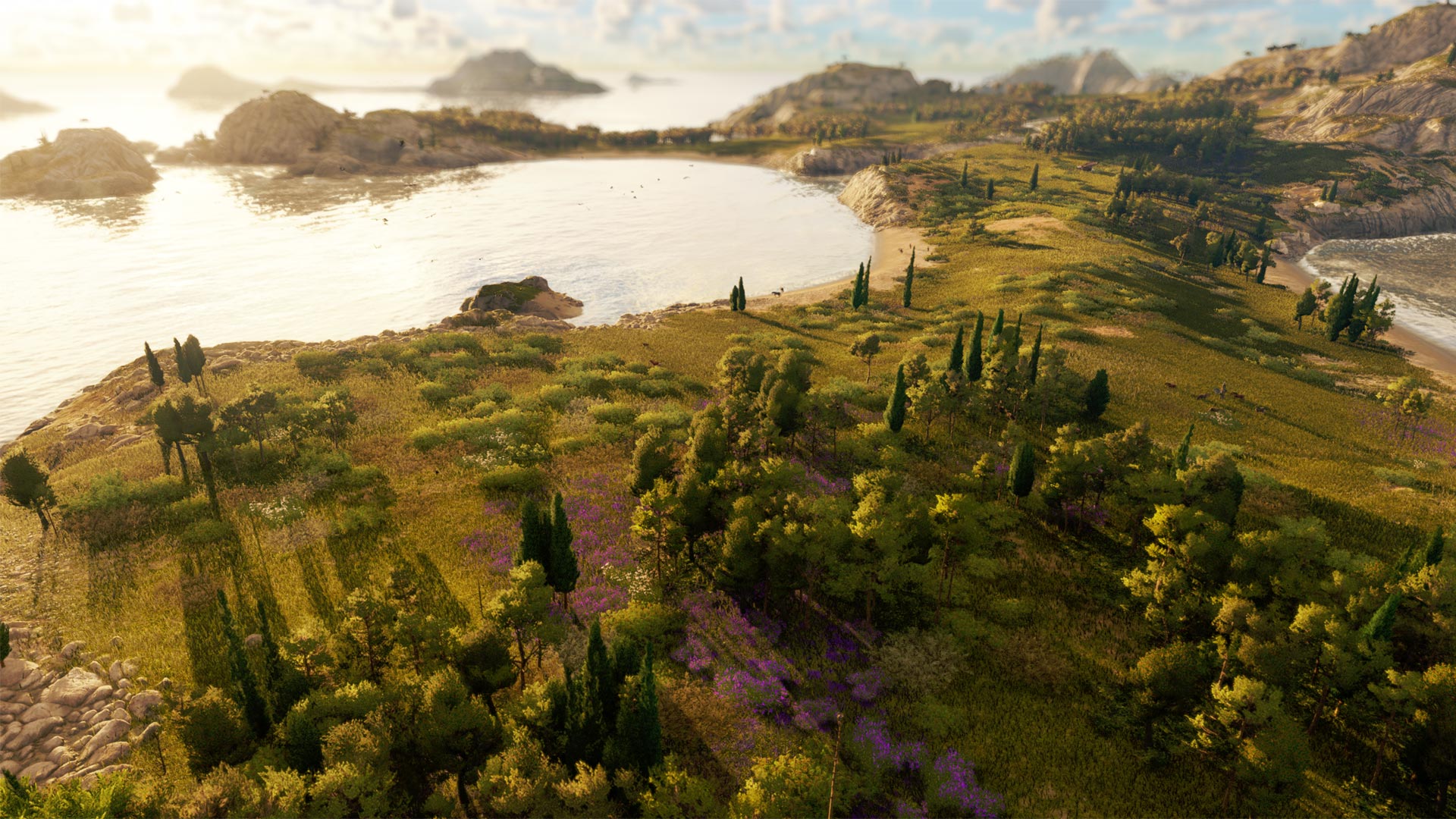 Das Bild aus dem Anno 117: Pax Romana-Test zeigt eine prachtvoll gestaltete Insel mit römischer Architektur. Auf dem felsigen Hochplateau thront Julius’ Villa mit gepflegten Gärten, Säulenhöfen und Zypressen. Unten am Hafen liegen römische Handelsschiffe und Werften, während Lavendelfelder und ein Leuchtturm die Küstenregion zieren. Das Meer ist türkis und ruhig – die Szene wirkt edel und mediterran.