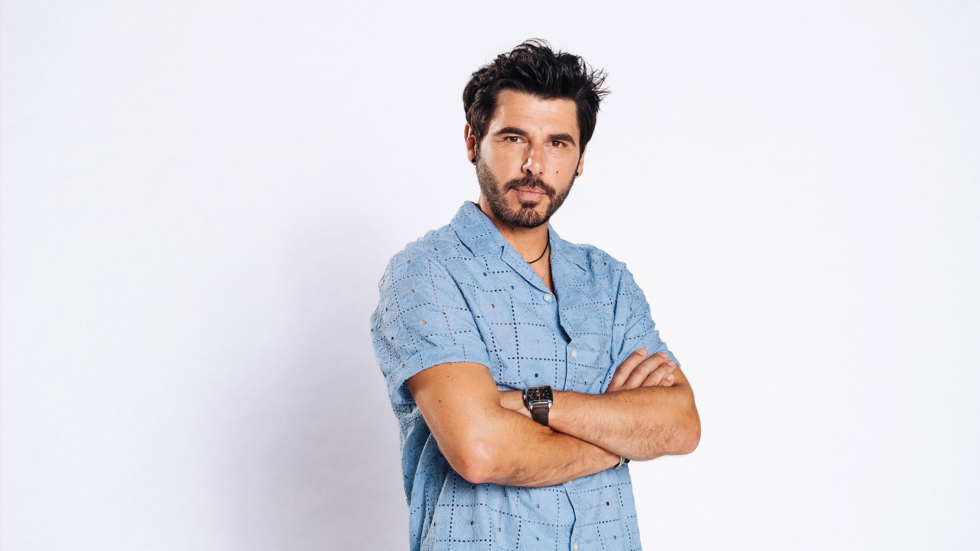 Auf dem Bild zur Alles was zählt Besetzung ist Schauspieler Marc Dumitru zu sehen, der in der Serie die Rolle von Kilian Reichenbach übernimmt. Er trägt ein hellblaues Leinenhemd und blickt ruhig und selbstbewusst in die Kamera. Mit neutralem weißen Hintergrund steht der Fokus ganz auf seiner Pose und seinem Gesichtsausdruck.