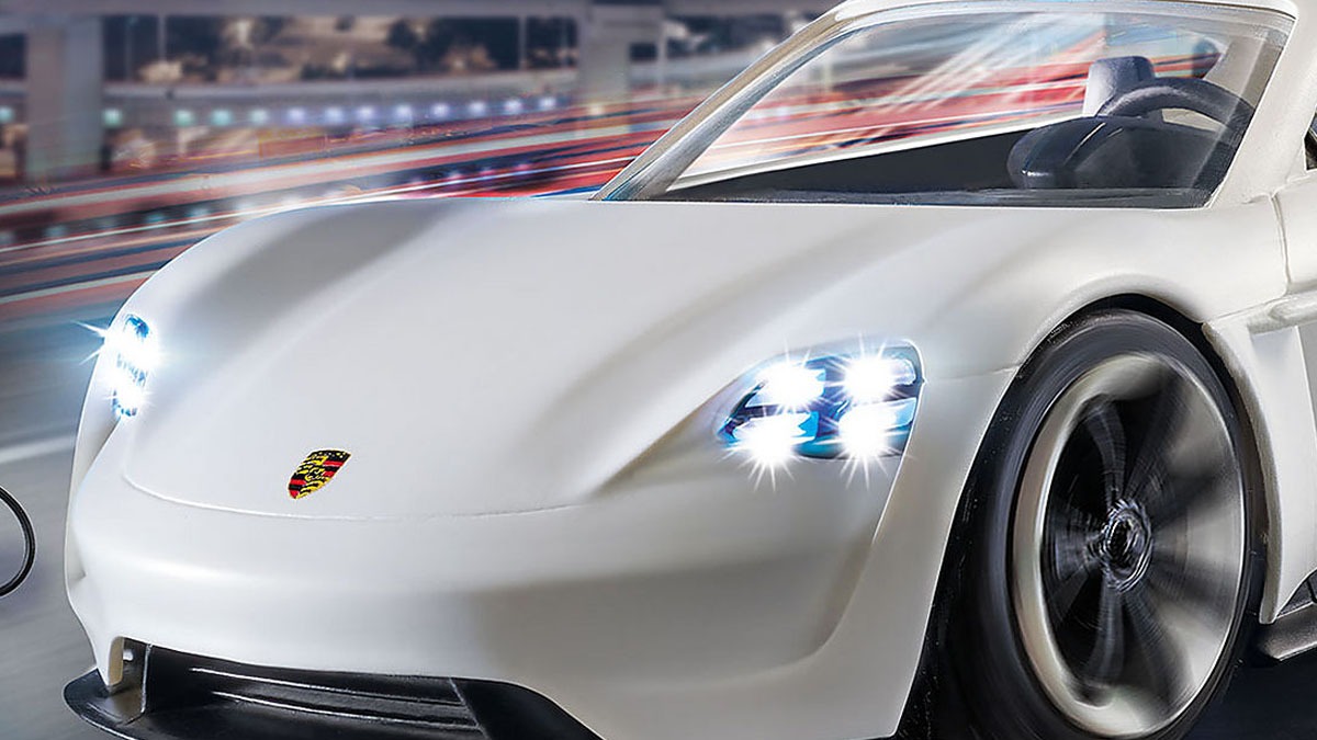 Der silberne Porsche Mission E wird im kommenden Playmobil: Der Film zu sehen sein und ist das flotte Gefährt des Geheimagenten Rex Dasher.