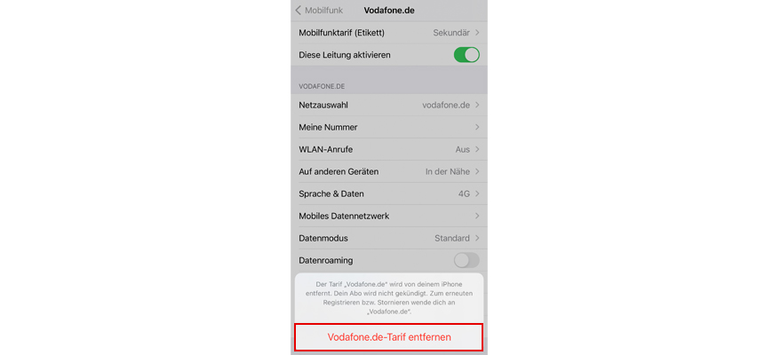 Wähl Vodafone.de-Tarif entfernen, um Deine eSIM zu entfernen.