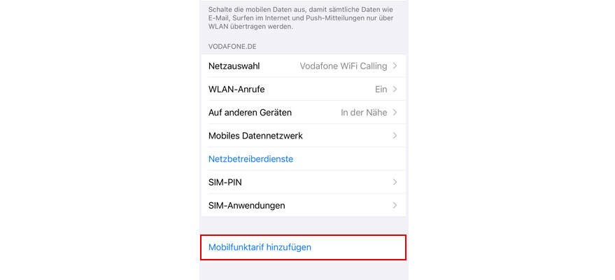 Füg zuerst Deinen Mobilfunktarif hinzu. Stell sicher, dass Dein iPhone mit dem Mobilfunknetz oder mit dem WLAN verbunden ist.