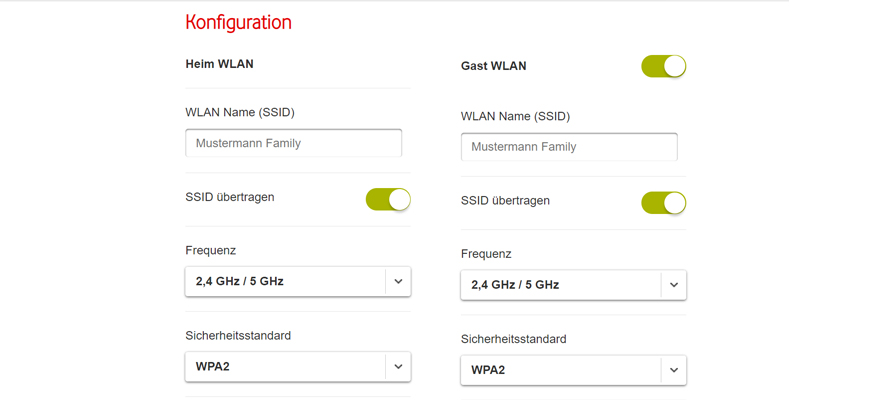 - Über Gast-WLAN aktivieren, schaltest Du Option ein oder aus. Gut zu wissen: Schaltest Du die Option ein, öffnet sich unter Konfiguration ein weiterer Bereich. Jetzt kannst Du Deinem Gast-WLAN einen eigenen WLAN-Namen (SSID) geben. Und auch das Kennwort für Dein Gast-WLAN setzen.