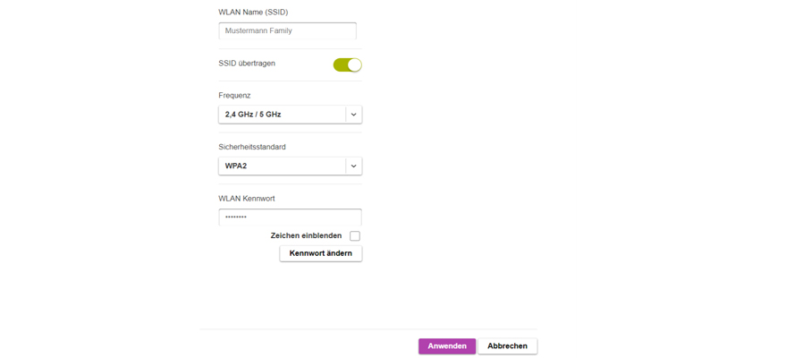 - Klick auf Anwenden. Dein WLAN-Name wird geändert. Und Deine WLAN-Zugangsdaten gespeichert. Gut zu wissen: Das Ändern bestimmter Optionen führt dazu, dass die aktuell verbundenen Geräte getrennt werden. Diese Geräte können möglicherweise die Verbindung automatisch wiederherstellen. Beachte bitte, dass das WLAN kurz getrennt wird, wenn Du Deine Änderung speicherst.