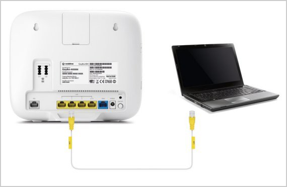 Verbinde Dein Gerät per Kabel (z.B. PC): Verbinde Deinen Computer mit einem der gelben LAN-Anschlüsse Deiner EasyBox. Nutz dafür das mitgelieferte LAN-Kabel.