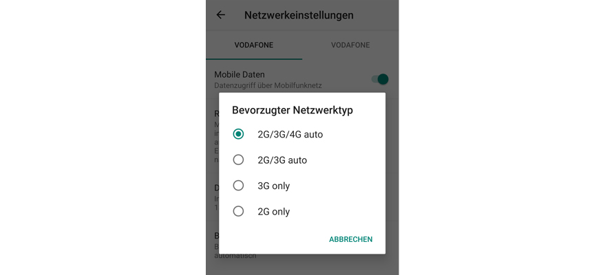 Je nach Aufenthaltsort sind unterschiedliche Netzwerktypen verfügbar. Stell den schnellsten Netzwerktypen ein, damit Dein Handy immer das Netz mit der schnellsten Daten-Geschwindigkeit und dem besten Empfang findet.
