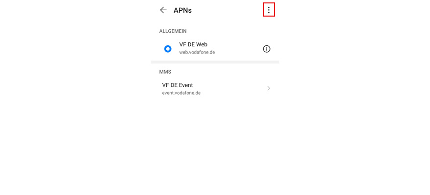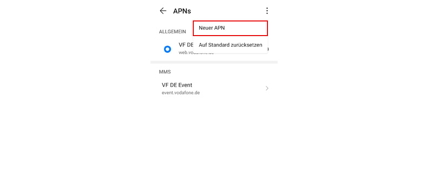 Tipp auf das Menü-Symbol, um einen neuen APN hinzuzufügen.