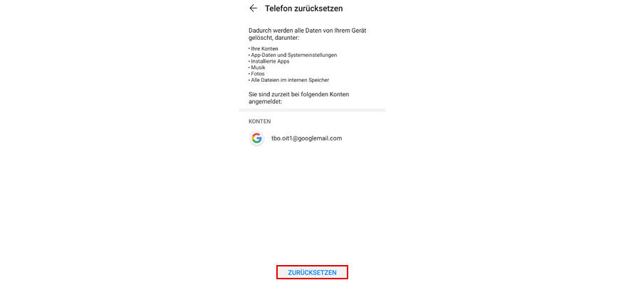 Wähl Zurücksetzen. Hinweis: Alle Daten werden aus dem Telefonspeicher gelöscht.