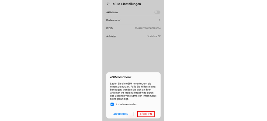 Tipp auf den Schieberegler neben Aktivieren, um die eSIM zu deaktivieren.