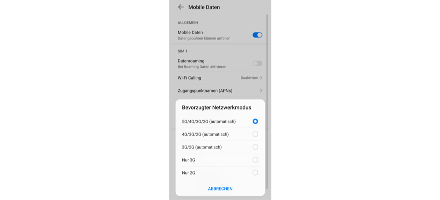 Je nach Aufenthaltsort sind unterschiedliche Netzwerktypen verfügbar. Stell den schnellsten Netzwerktypen ein, damit Dein Handy immer das Netz mit der schnellsten Daten-Geschwindigkeit und dem besten Empfang findet.
