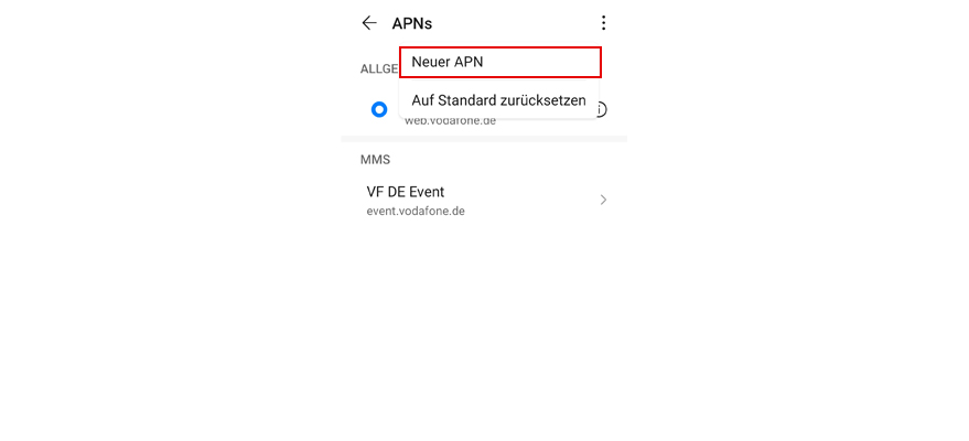 Tipp auf das Menü-Symbol, um einen neuen Zugangspunktnamen (APN) hinzuzufügen.